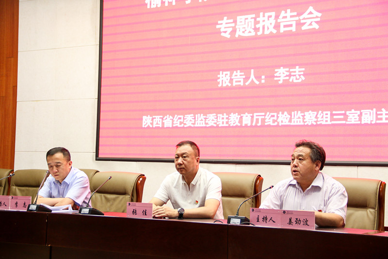 为深入推进第四个纪律教育学习宣传月活动,7月6日下午,我校在逸夫楼一楼报告厅举办“学党史”纪律教育专题报告会。陕西省纪委监委驻教育厅纪检监察组副组长张佳、三室副主任李志,我校党委副书记、纪委书记、监察专员姜劲波,全校副处级以上干部、机关科级干部170多人参加报告会。姜劲波主持。